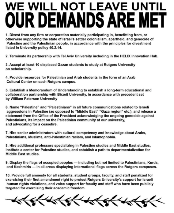 “For those wondering, here are the demands of the Rutgers SJP chapter they are bargaining with the university.