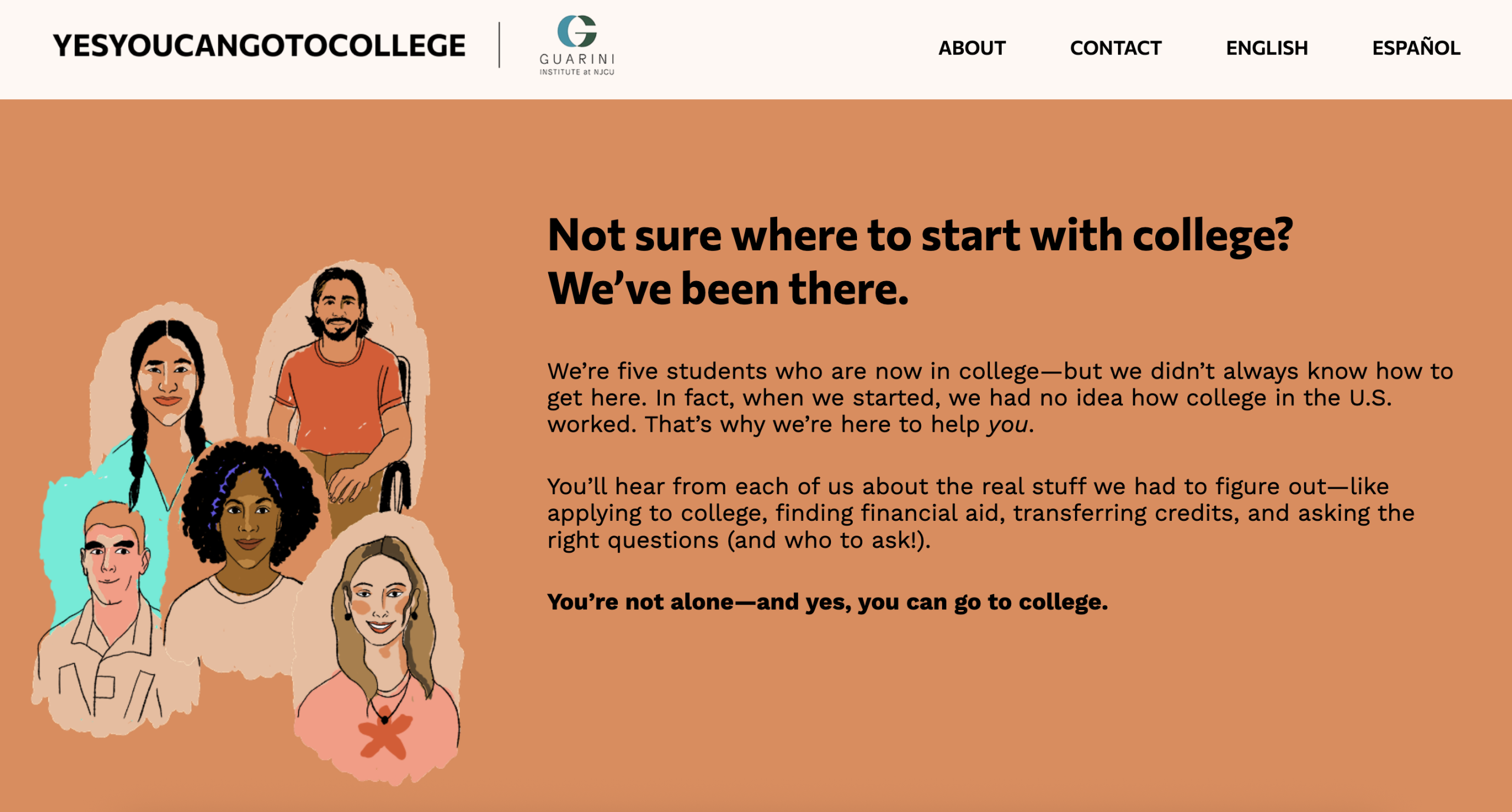 YesYouCanGoToCollege.org, is offered in both English and Spanish, with additional languages such as Portuguese and French set for the future of the institute. The Spanish version of the site is called SiSePuedeLaUniversidad.org.