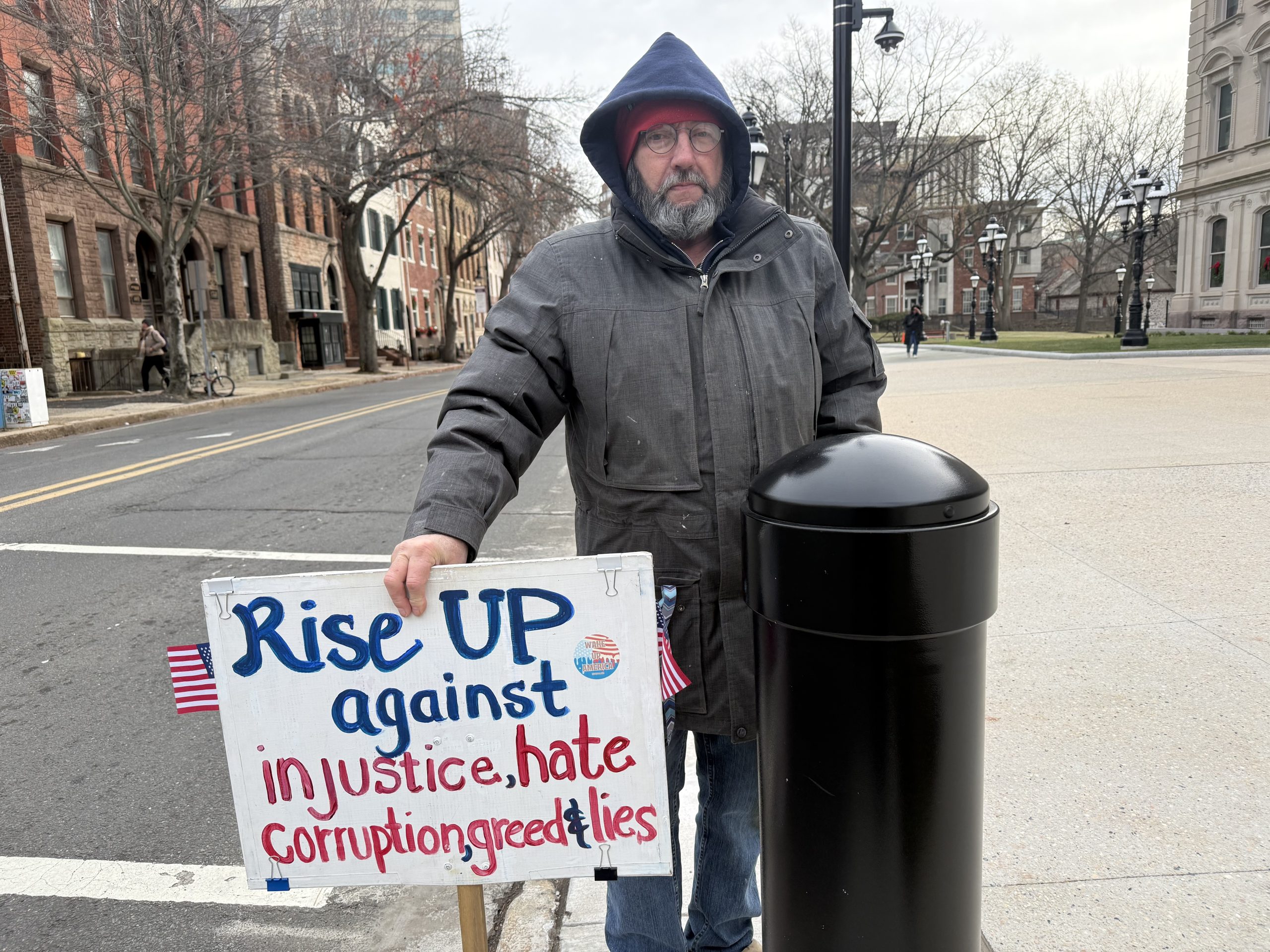Chris Schultz holding up a sign that reads, “Rise UP against injustice, hate, corruption, greed, & lies,” outside the State House in Trenton, NJ, on Dec. 8, 2025.
