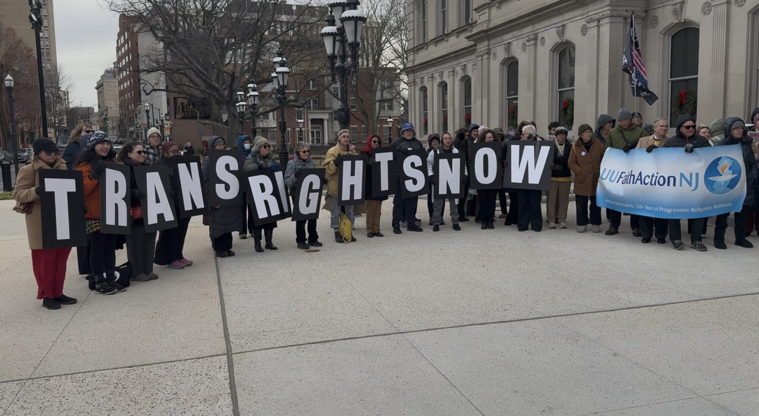 A group of demonstrators holding signs that spell, “Trans Rights Now,” in front of the State House in Trenton, NJ, on Dec. 8, 2025.