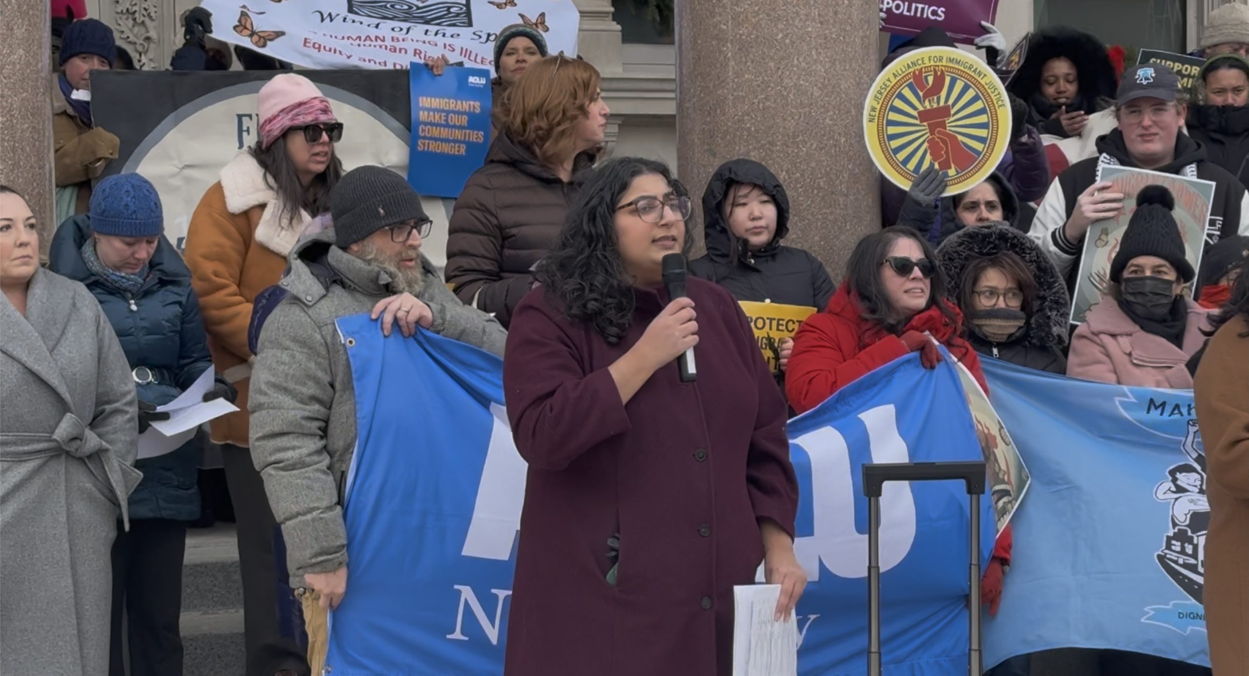 Ami Kachalia, campaign strategist of ACLU-New Jersey, speaking to a crowd of demonstrators outside the State House in Trenton, NJ, on Dec. 8, 2025.