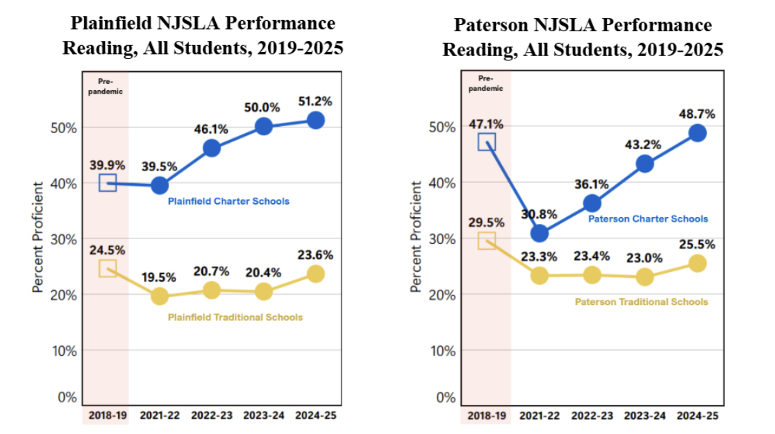 Last week, the New Jersey Department of Education released the spring 2025 New Jersey Student Learning Assessment (NJSLA) scores for all public school districts in the Garden State. A vast majority of New Jersey’s 64,000 charter school students are students of color and 76% of charter school students come from economically disadvantaged backgrounds. Charter schools are quickly closing the literacy gap and are within striking distance of outperforming the statewide average in one of the highest performing public school systems in the country. Overall, 51.9% of charter students are proficient or higher in reading compared to the state average of 53.1%. In Newark and Jersey City, charter students outperform the state average in reading, while in Plainfield and Paterson, charter students have exceeded pre-pandemic reading levels.