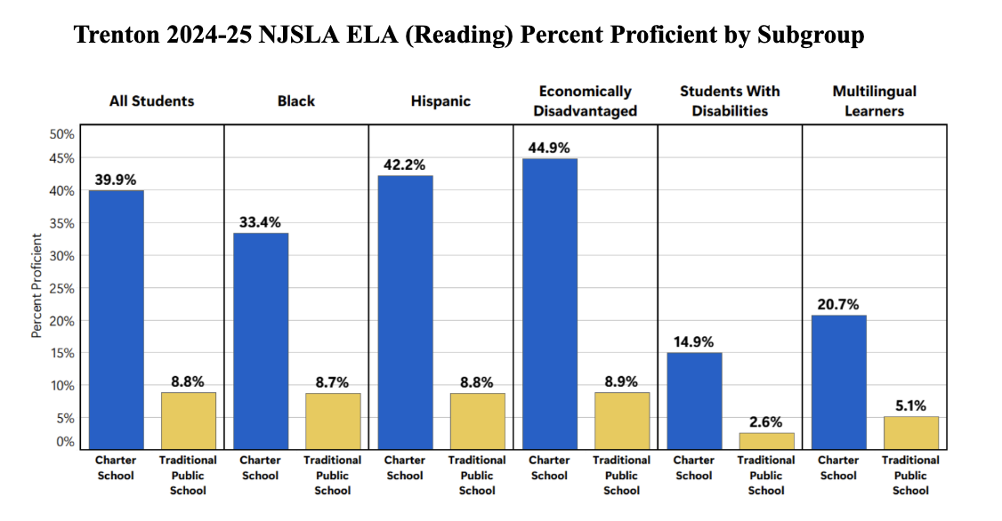 In Trenton, 85% of the city’s 4,200 charter students are economically disadvantaged, 10% are students with disabilities, and 9% are multilingual learners. A 2025 analysis shows that Trenton charter students are four and a half times more likely to read at grade level than their district peers. Despite serving just 20% of Trenton public school students, Trenton charters account for nearly 60% of all students reading on grade level in the city.