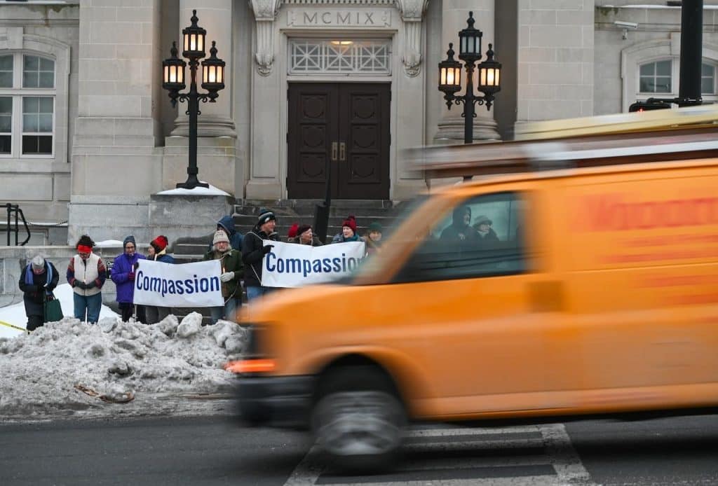 En una fría noche de viernes reciente, un grupo de residentes, abrigados, se reunió detrás de montones de nieve sucia acumulada frente a la corte del condado de Bridgeton para mostrar su apoyo a la comunidad inmigrante.
