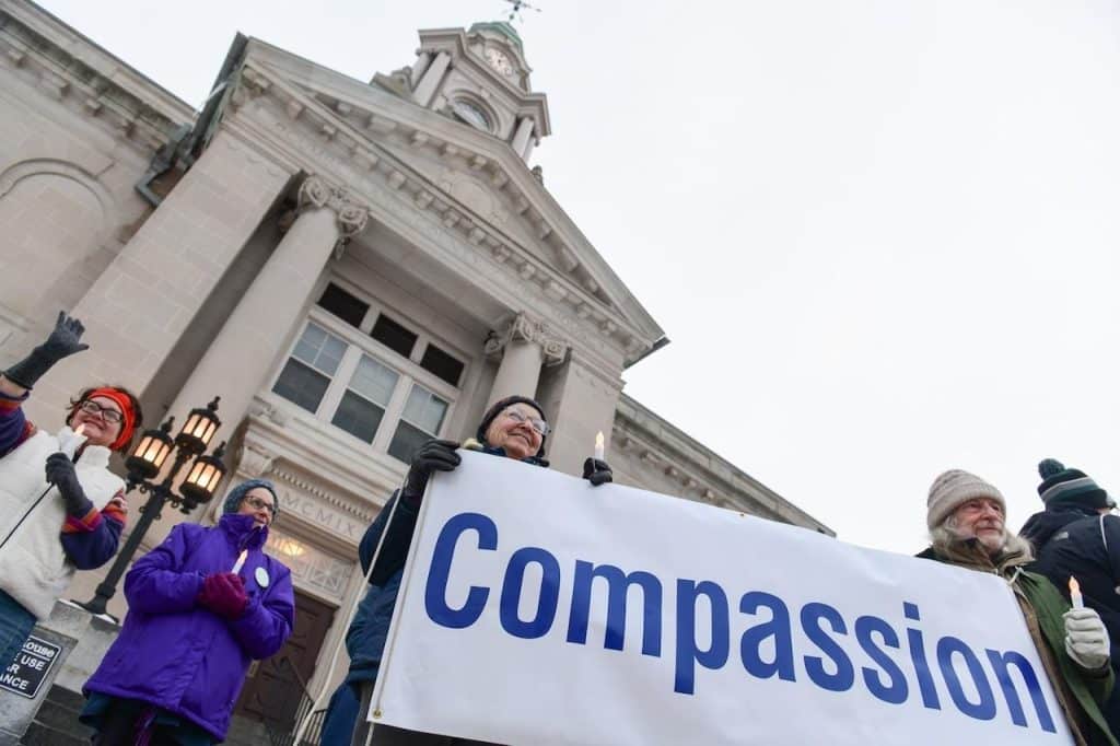 En lugar de cantar, sostenían velas eléctricas y dos letreros que decían “Compasión”.