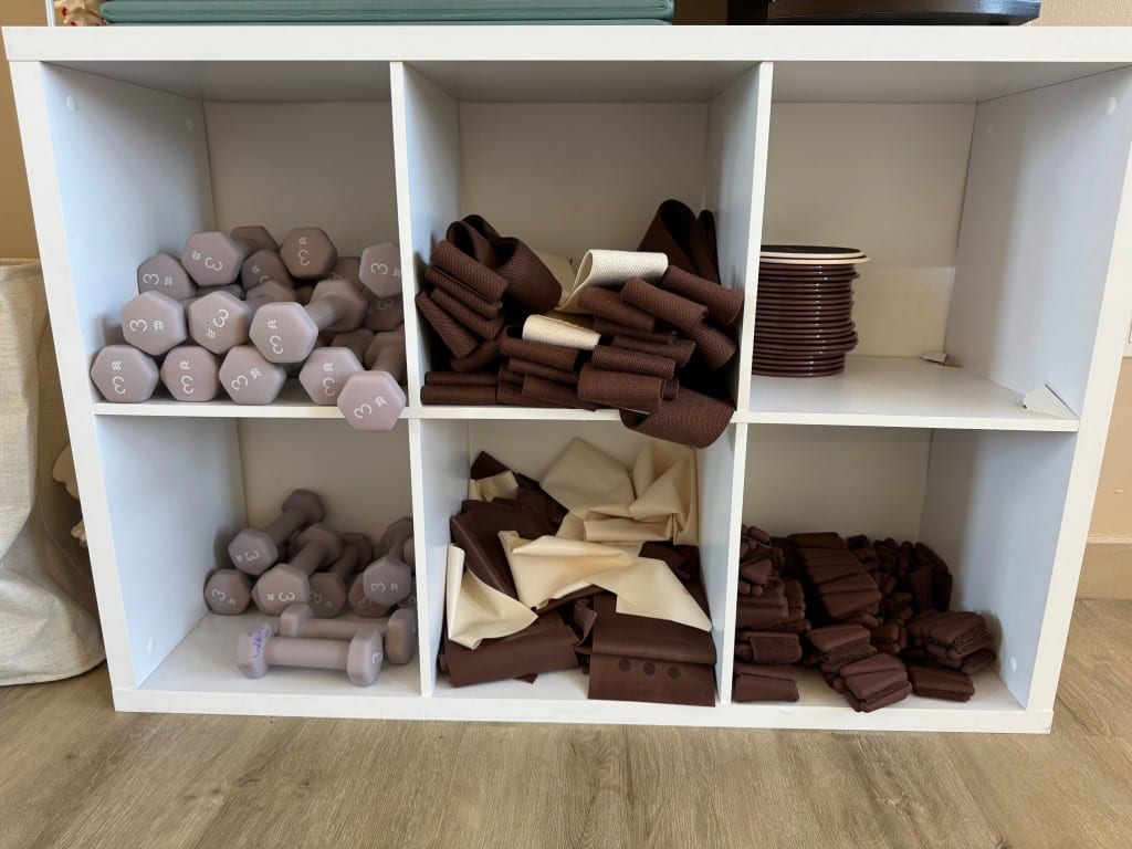 A cubicle inside PilatesBae Studio holds weights, resistance bands and other equipment used during classes. The Maplewood studio offers a variety of Pilates sessions designed to support strength, mobility and mindful movement for all experience levels. Photo Credit: Amina Ali