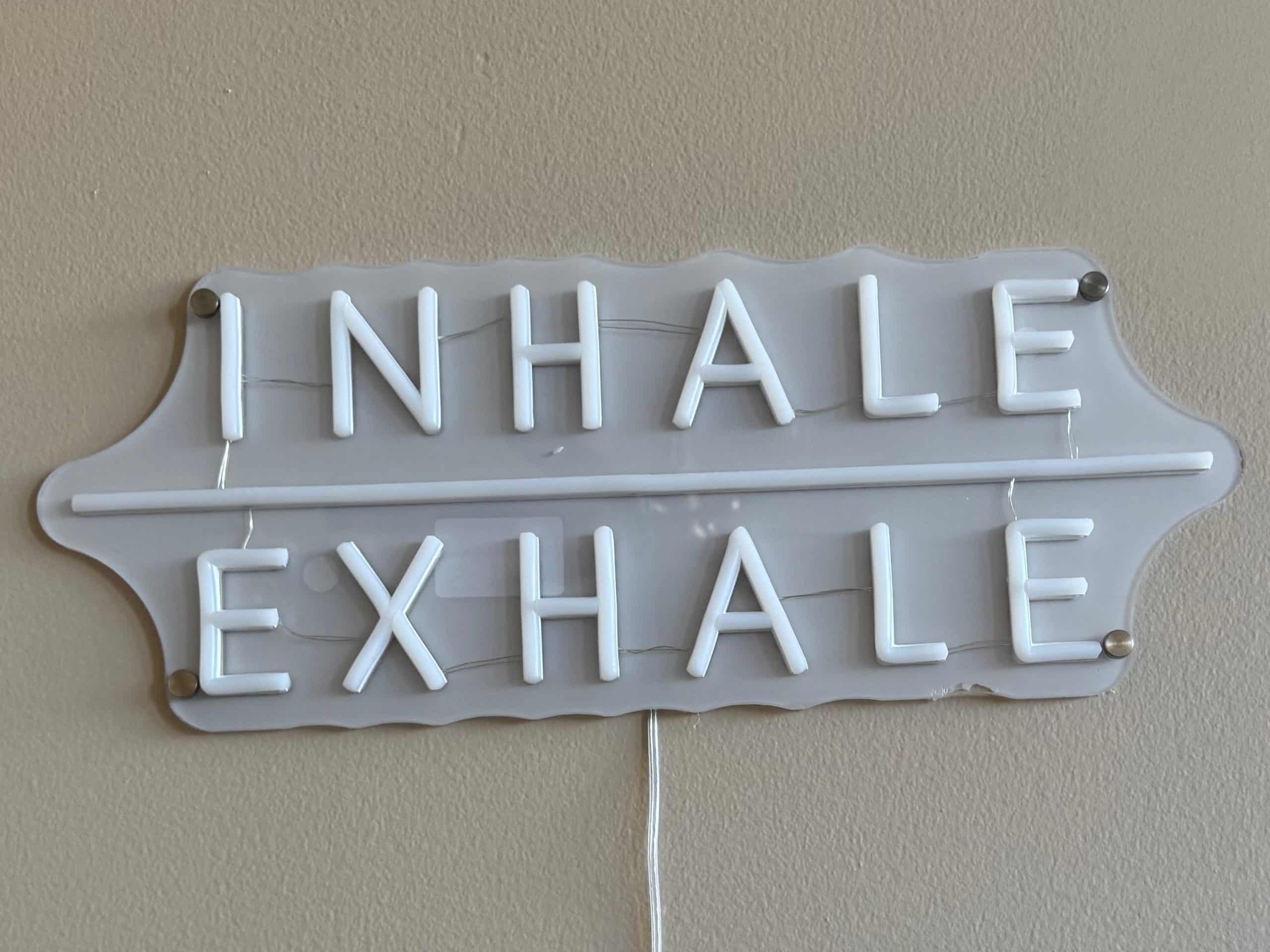 A sign reading “Inhale, Exhale” inside PilatesBae Studio reflects the focus on breath work and mindful movement that guides each class. Photo Credit: Amina Ali