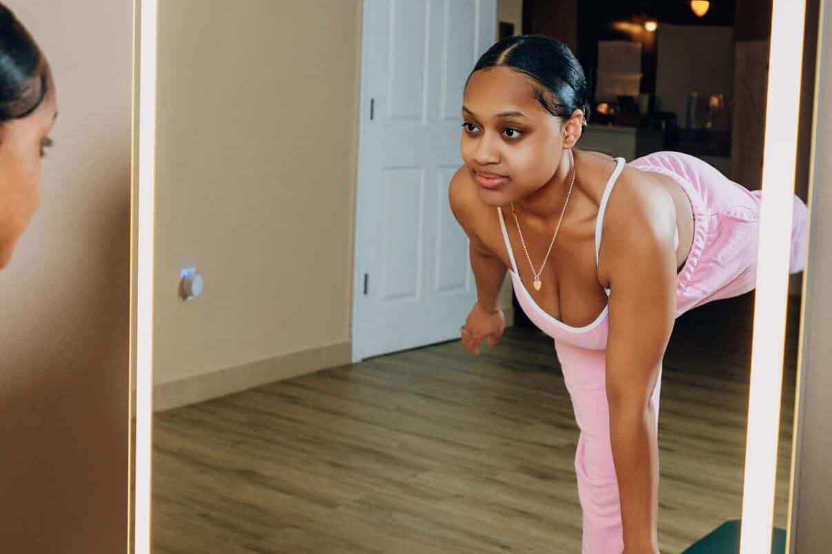 Bayyianah “Bay,” founder of PilatesBae Studio, checks her form in the mirror while demonstrating Pilates, emphasizing proper alignment, strength, and mindful movement. Photo Credit: Bayyianah