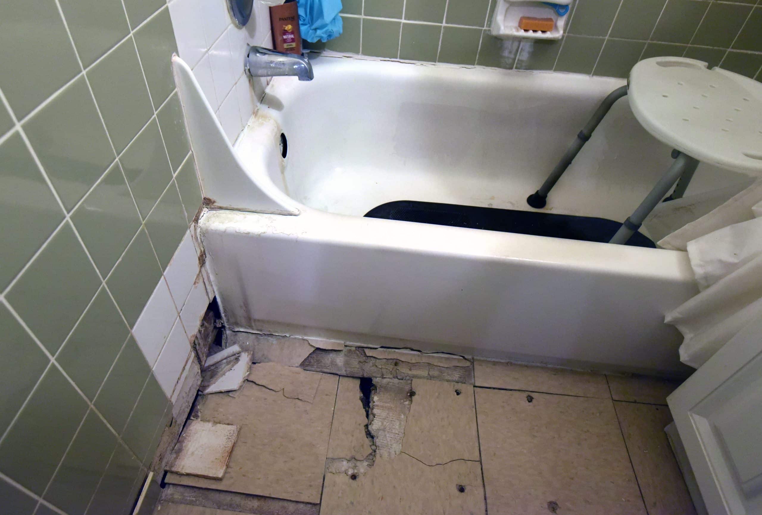 Ryan Brittingham said her son can’t play safely outside her Tamarack apartment because for the past two years, a wobbly piece of plywood has replaced the concrete walkway that used to lead to her door. Betty Garrett, also in Tamarack, places a folded-up towel atop the broken flooring alongside her bathtub hoping to prevent a fall.