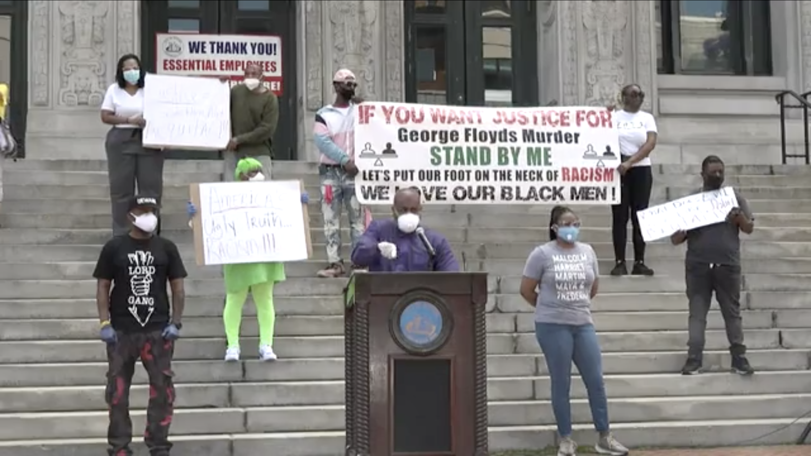 | Newark Mayor Ras Baraka speaks on the steps of City Hall at a protest rally for George Floyd (City of Newark/Facebook photo) |