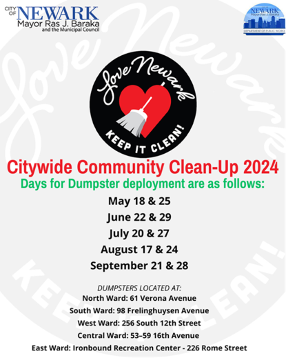 Mayor Ras J. Baraka announced today that the Department of Public Works (DPW) is resuming its “Love Newark Keep it Clean” campaign by deploying trailers of rubbish removal equipment and dumpsters to each ward beginning on Saturday, May 18, and continuing two Saturdays a month, through Saturday, September 28. A schedule of dates and locations follows. Starting on Saturday, May 18, at 8 […]
