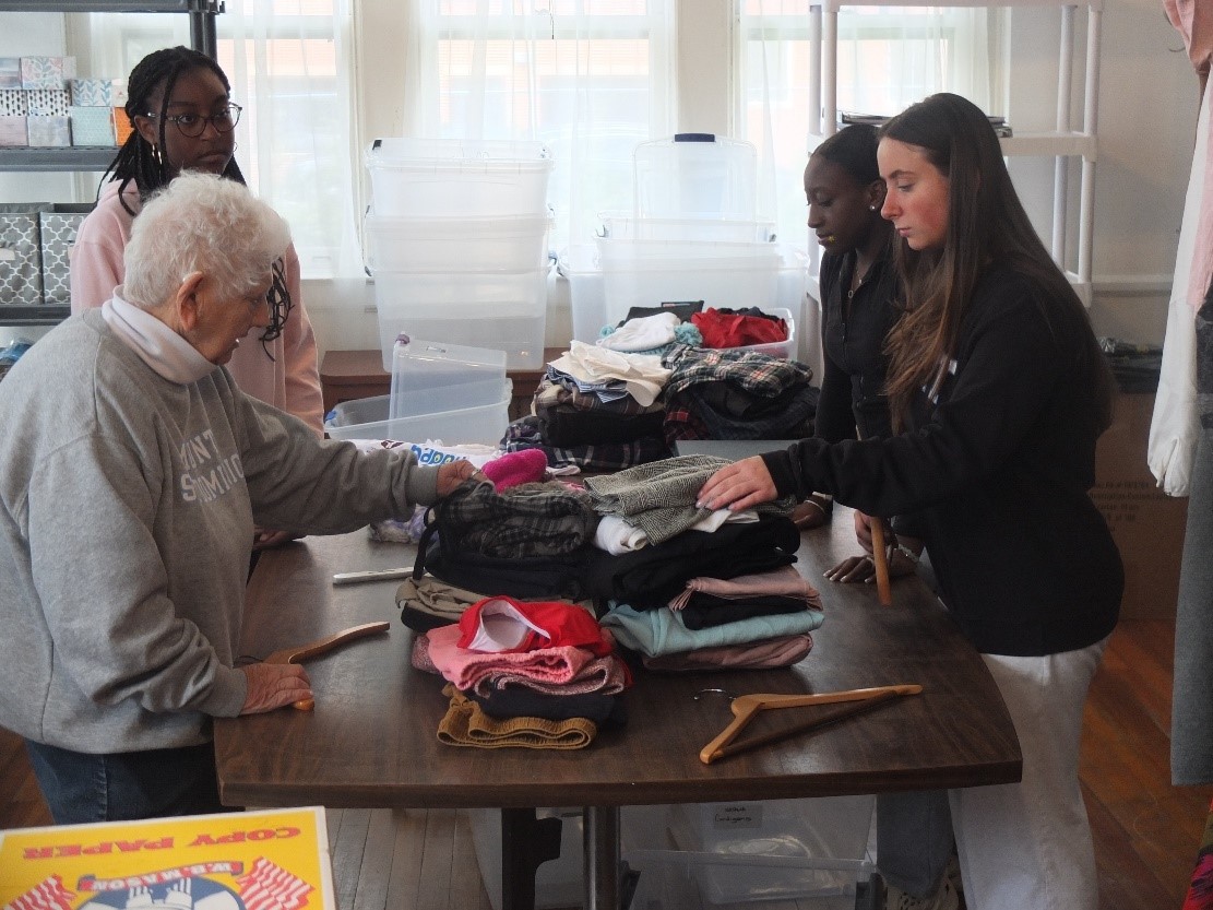 The Easter giveaway was made possible through the generosity of St. Elizabeth University and nine archdiocesan parishes and Catholic schools, which contributed between 50 and 100 items each. Students from one of these schools, Mount St. Dominic Academy in Caldwell, also assisted at the Newark event. There they witnessed the significant need regularly addressed by The Mercy House, even selecting jackets for parents who required more than candy for their children this Easter.