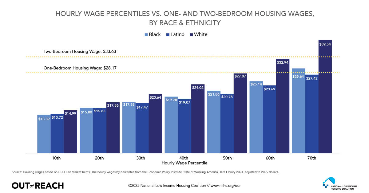 Racial disparities deepen the impact of the housing crisis. Black and Latino renters in New Jersey and nationwide face higher rates of cost burden and are more likely to live in substandard or unstable housing. Wage gaps further exacerbate the problem: Black workers earn a median of 22% less than white workers, while Latino workers earn 26% less. At the lower earners’ level, Black and Latino workers make 11% and 9% less, respectively, than their white peers.